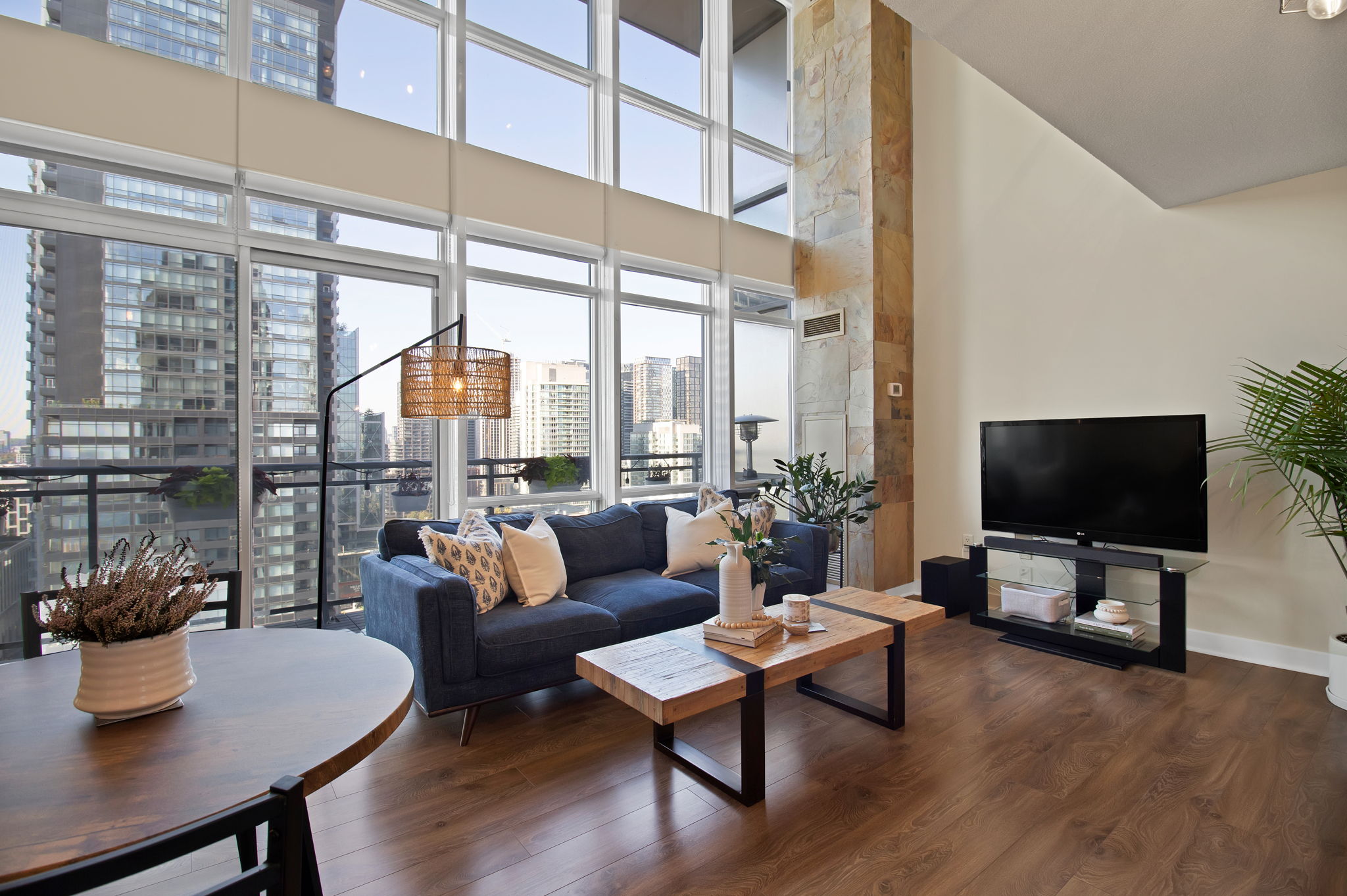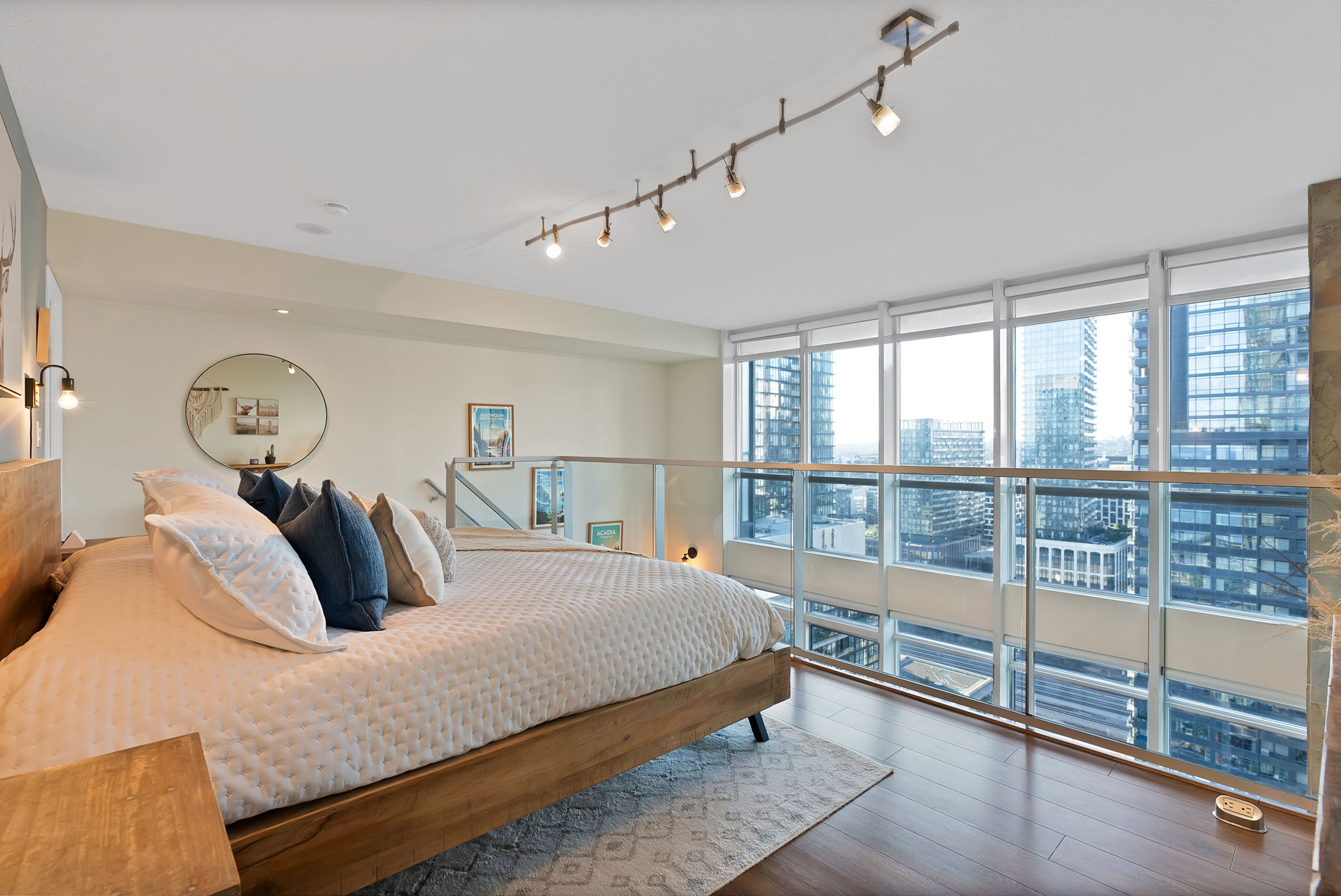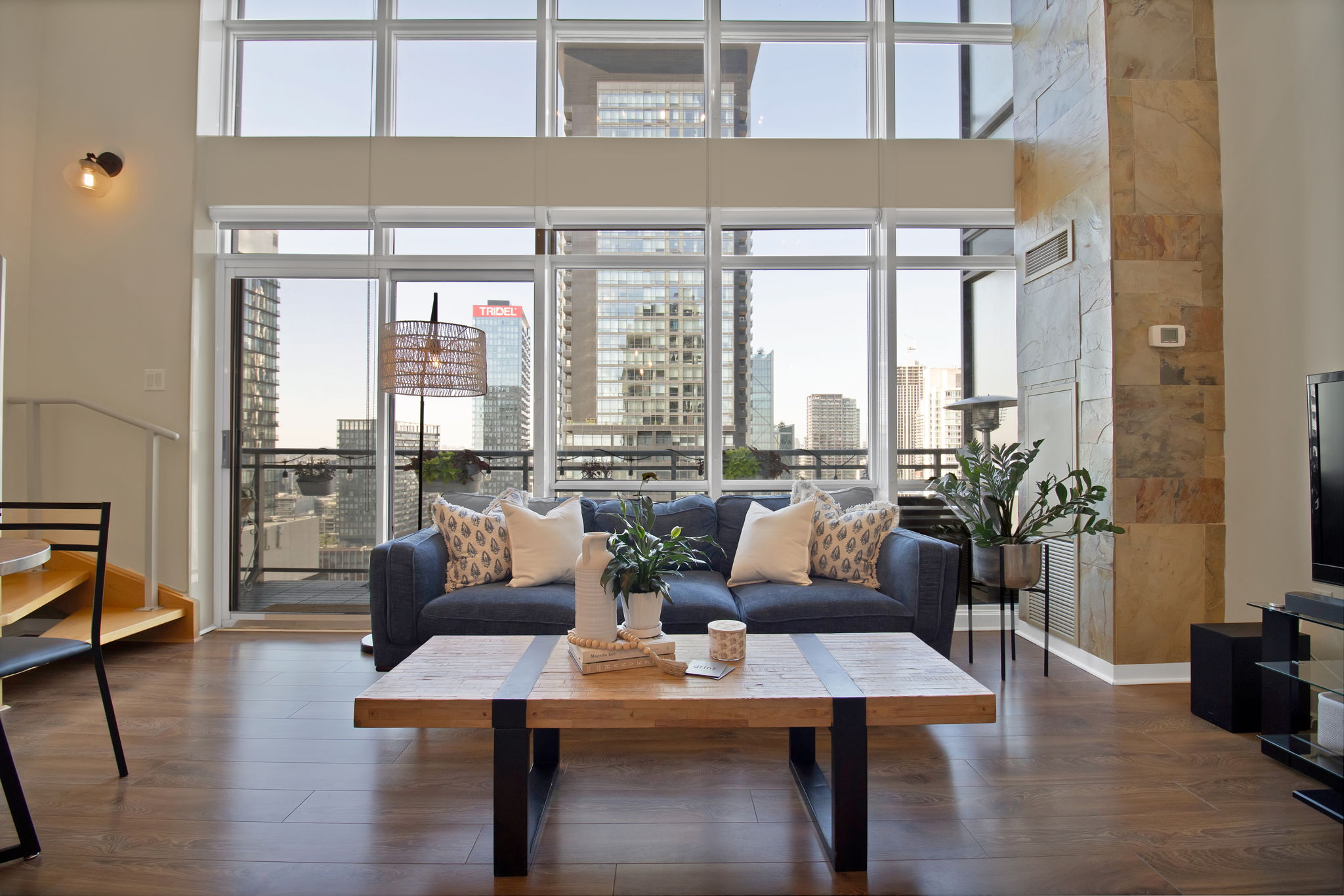Welcome to a truly exceptional urban loft—a home perfectly designed for urban professionals and budding families who crave style, space, and vibrant city living. Step inside to dramatic double-height ceilings and a striking floating staircase with glass railings. The space is flooded with natural light from floor-to-ceiling windows, offering a breathtaking panorama of the city skyline and the iconic CN Tower.