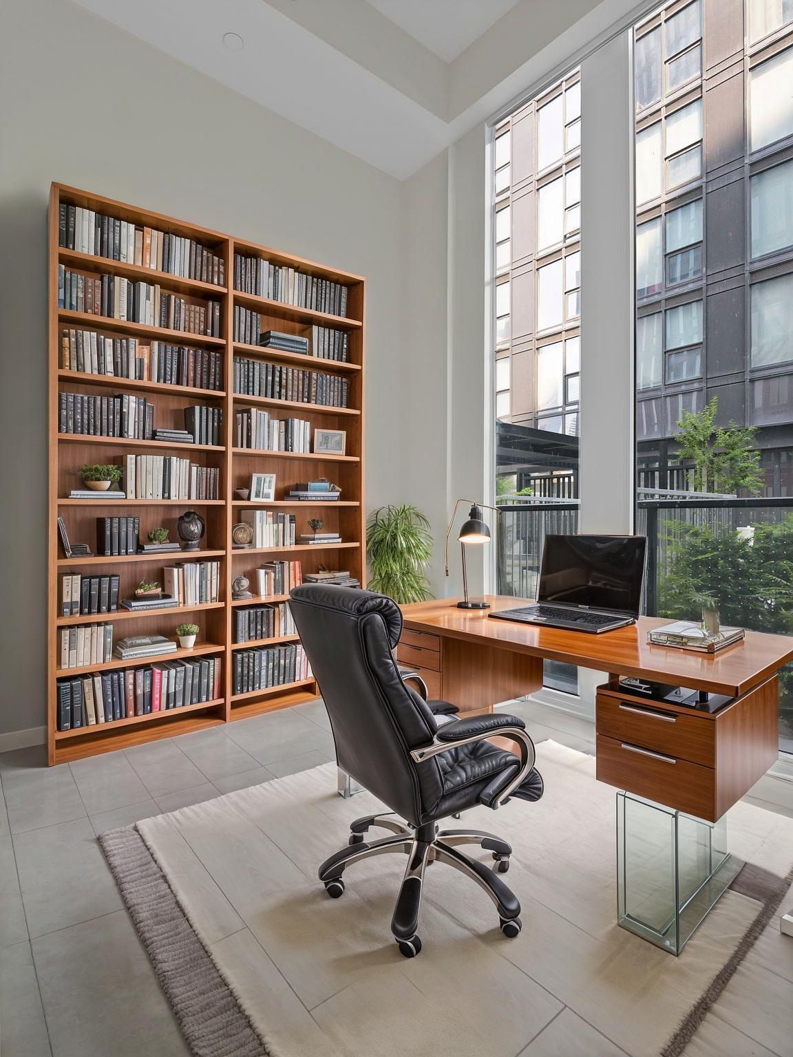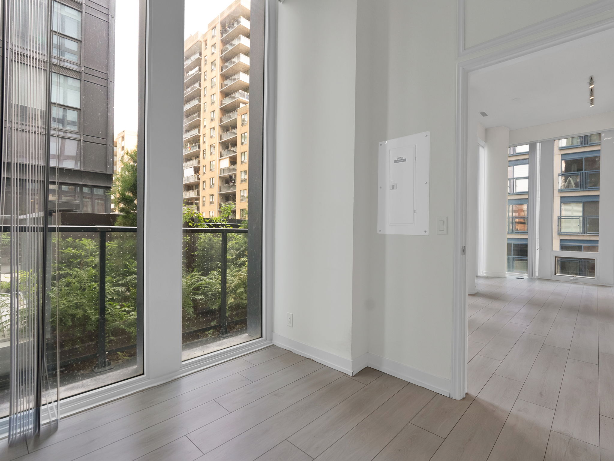 This bright, open-concept suite features soaring 11-foot ceilings and expansive wall-to-wall windows, creating an impressive sense of space and filling the home with natural light. At 659 square feet, the layout is thoughtfully designed for flexible living—ideal for relaxing, entertaining, or working from home.
