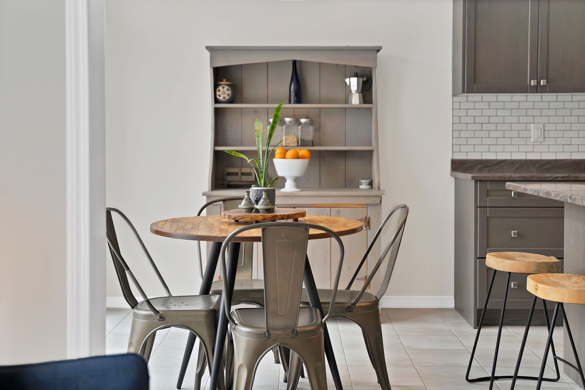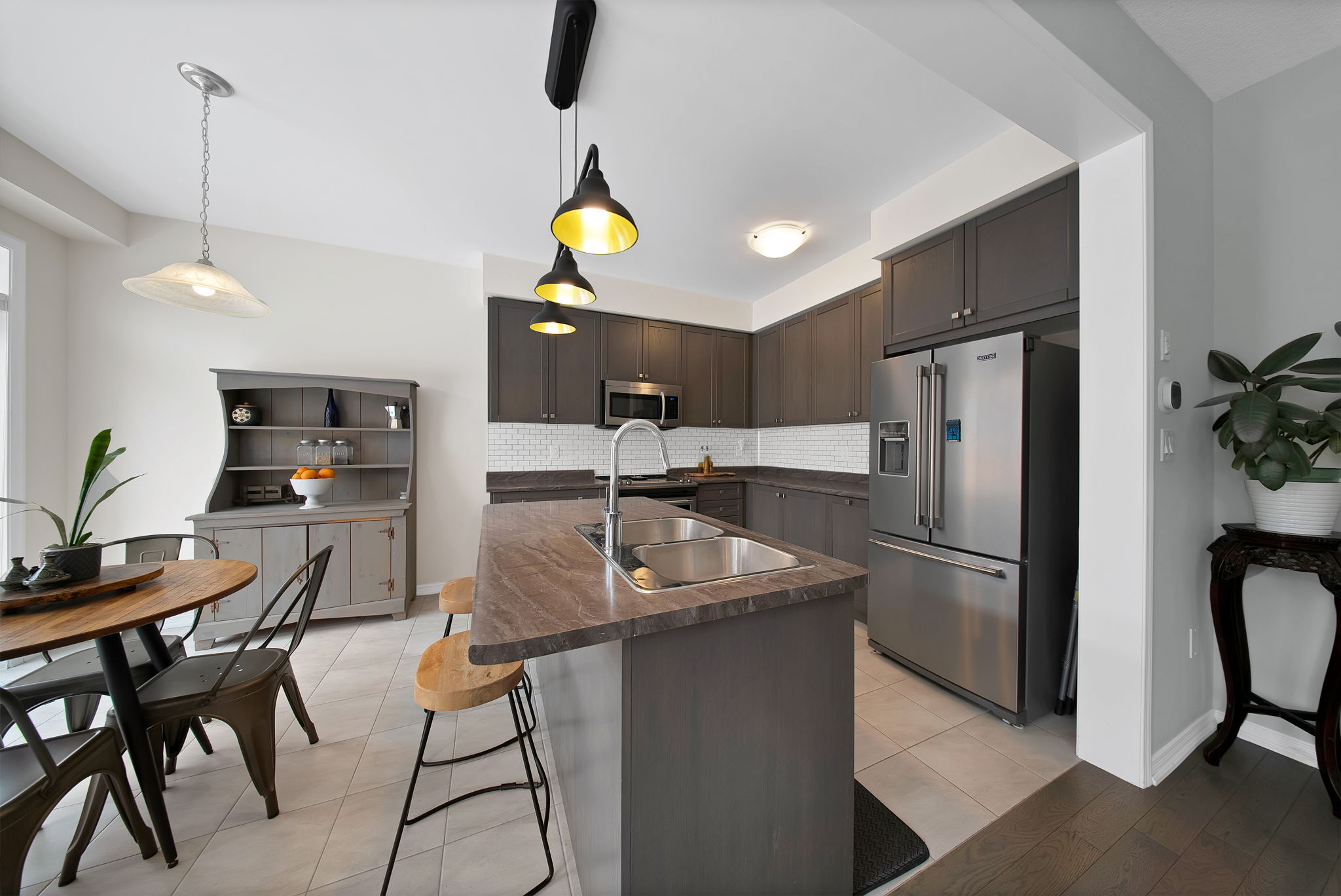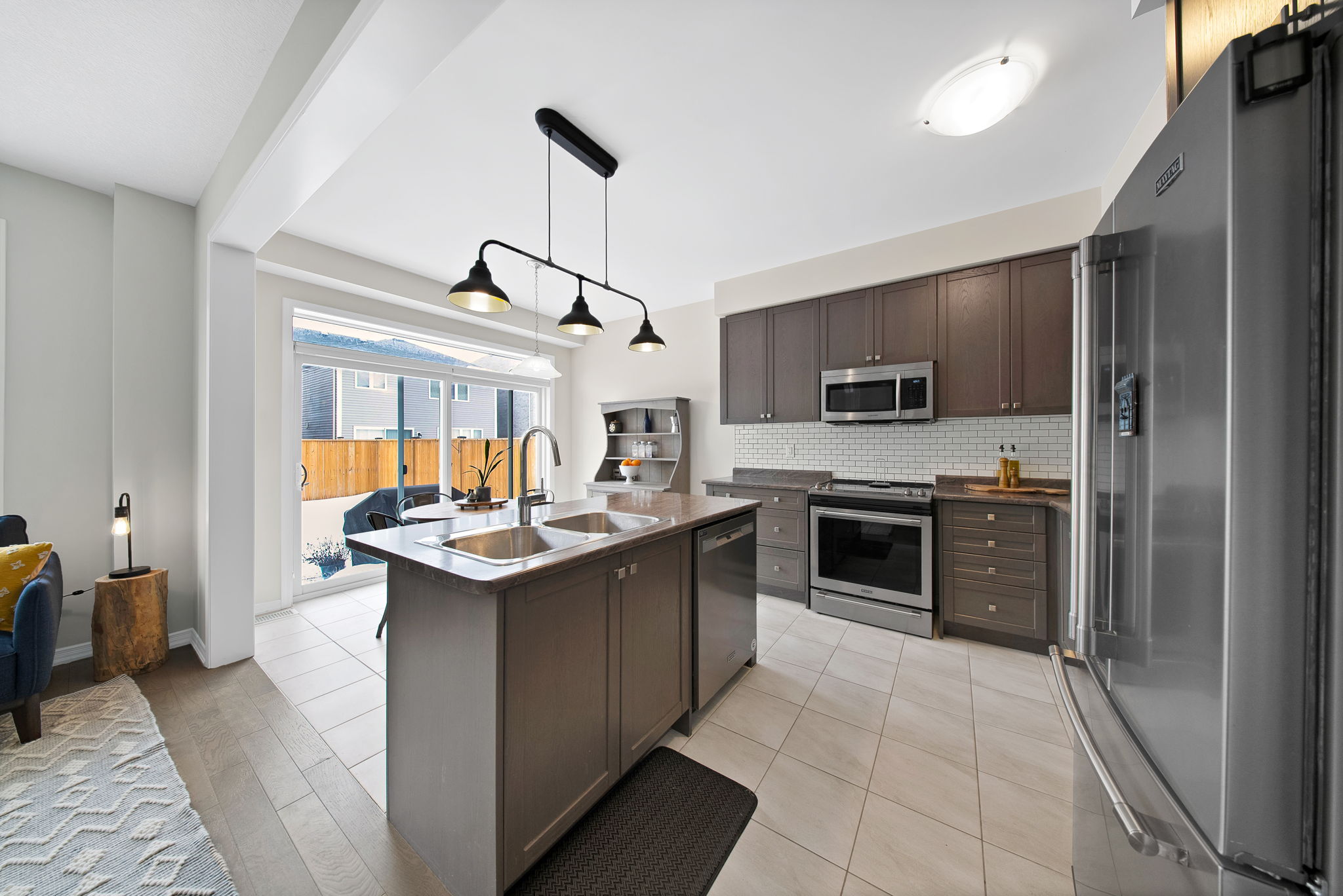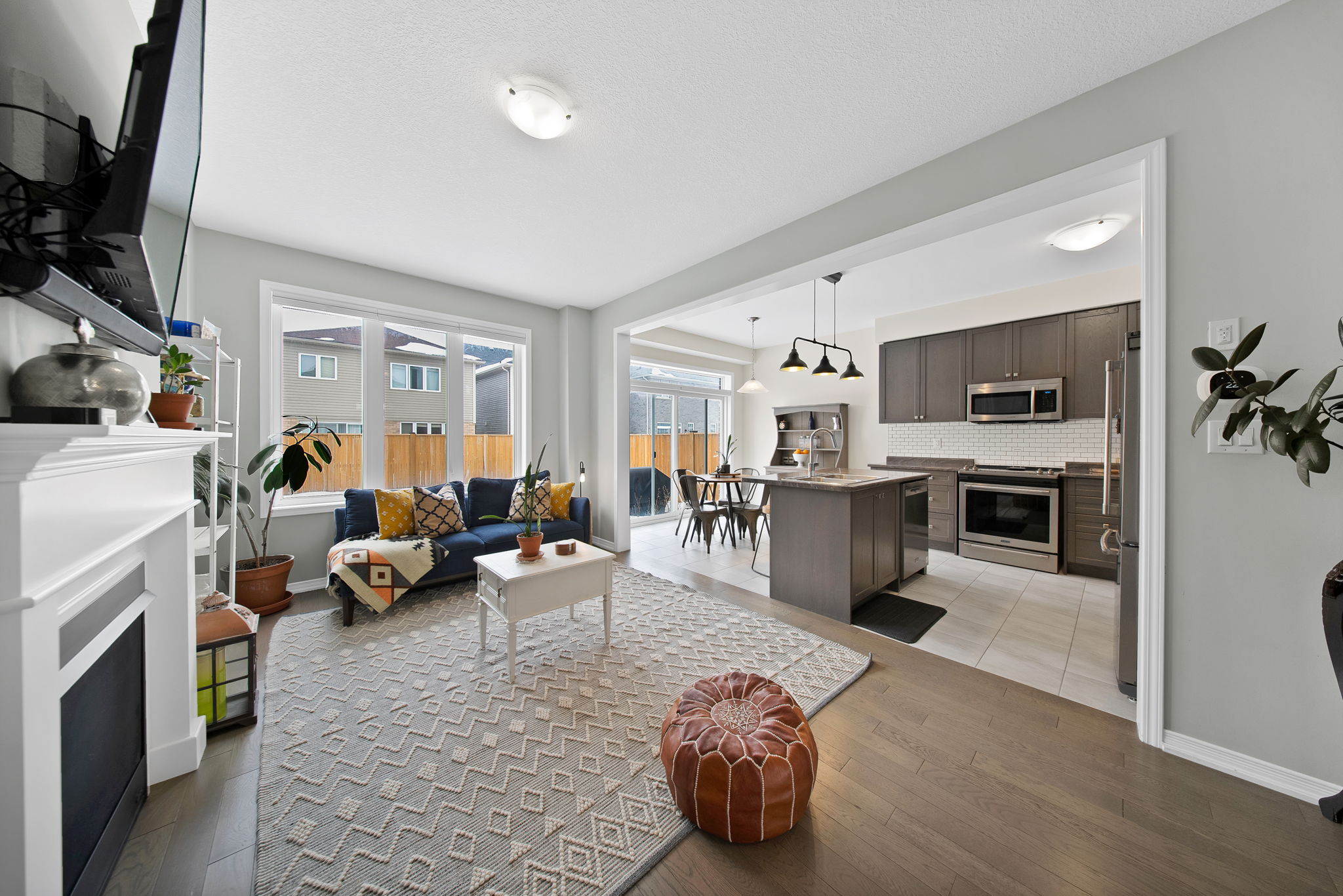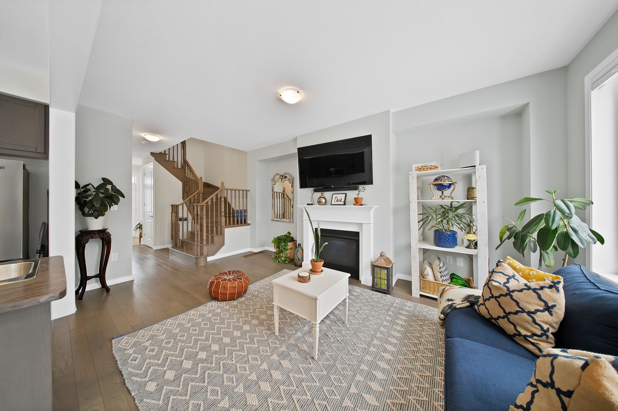 The bright open concept main floor is designed for everyday living and connection, featuring soaring 10 ft ceilings and large windows that allow natural light to pour in throughout the day. The inviting living area is centred around a cozy fireplace, creating a warm and comfortable space to gather. The kitchen offers plenty of cabinetry, generous counter space, stainless steel appliances, and a central island that works beautifully for both daily routines and entertaining.